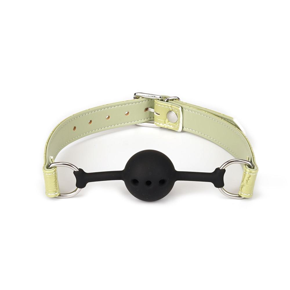 - Воздухопроницаемый кляп-шарик. Специальные отверстия позволяют дышать во время сессии. Крепится с помощью ремешка, регулируется по объему головы от 46,6 до 61 см. Диаметр шарика 4,4 см.